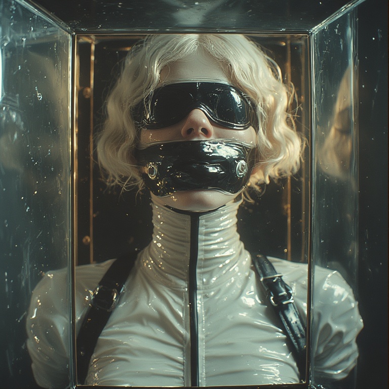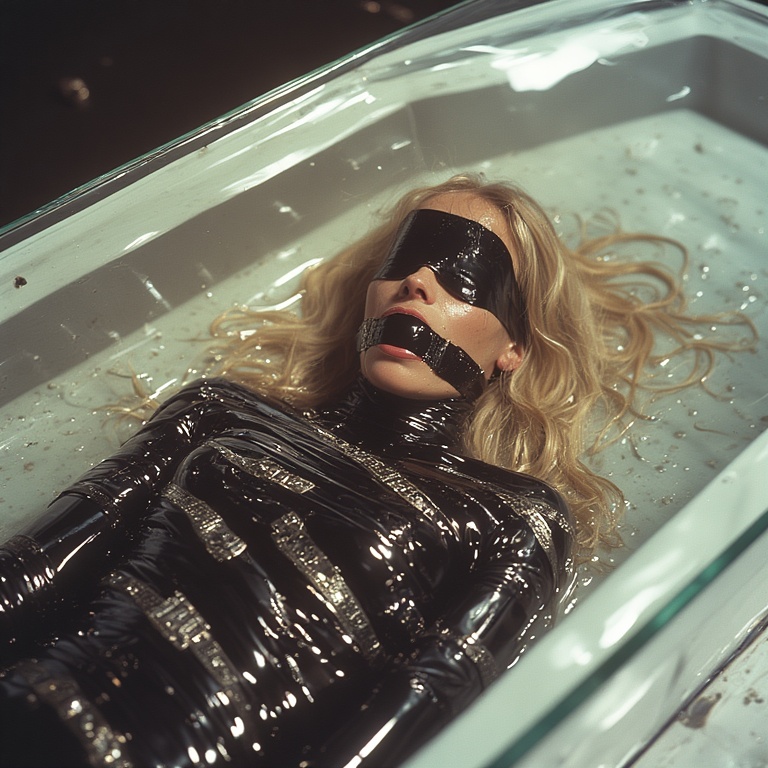 in the middle of the room there stands like a glass coffin or sarcophagus...indide is a women bound gagged and blindfolded tight in latex. (maybe lily lou or anastasia doll )